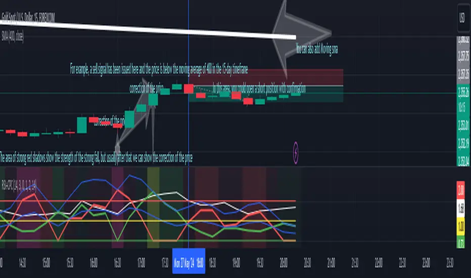 This indicator, named "drkhashix Candle Power Comparison with RSI" or "RSI+CPC", first calculates the strength of green and red candles based on the average of two periods. The number one indicates a normal average. The higher the lines move, the stronger the candle powers become, and conversely, the lower they move, the weaker the powers become.