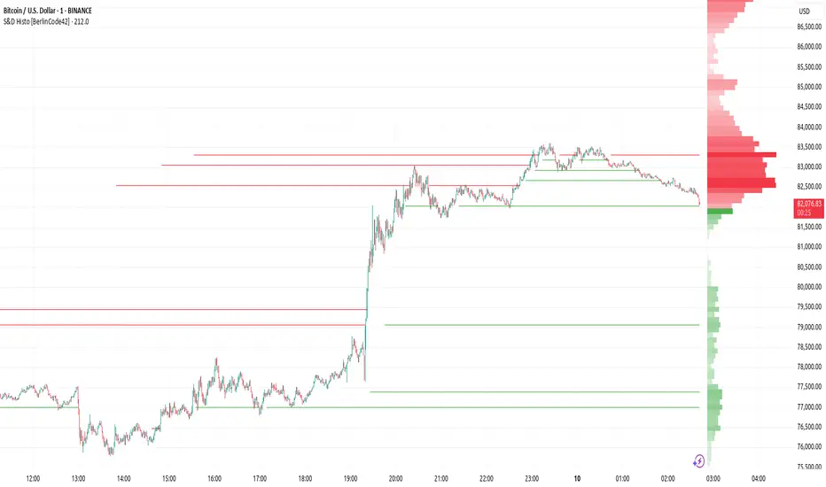 This is a Supply & Demand Histogram—also referred to as a Heatmap—that highlights key S&D levels on the chart. Unlike traditional approaches that use volume, this script identifies specific chart patterns and evaluates them to generate the Supply & Demand Histogram. It analyzes the Supply and the Demand separately.