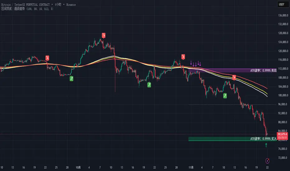 - 区间反转:当价格触及“动态顶底区间”的上沿或下沿,并且出现 SuperTrend 变色或箭头反转信号时,可考虑反向操作。