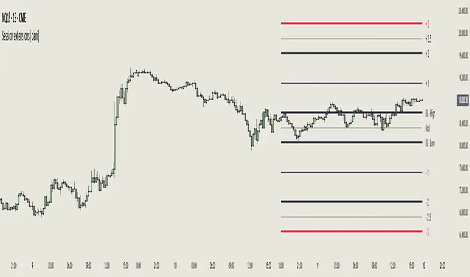 The Session Extensions [dani] indicator is a customizable tool designed to visually represent key price levels during a specified trading session. It calculates and displays the high, low, and midpoints of the session, along with extension levels based on user-defined multipliers. These extensions help traders identify potential support and resistance zones beyond the initial session range.