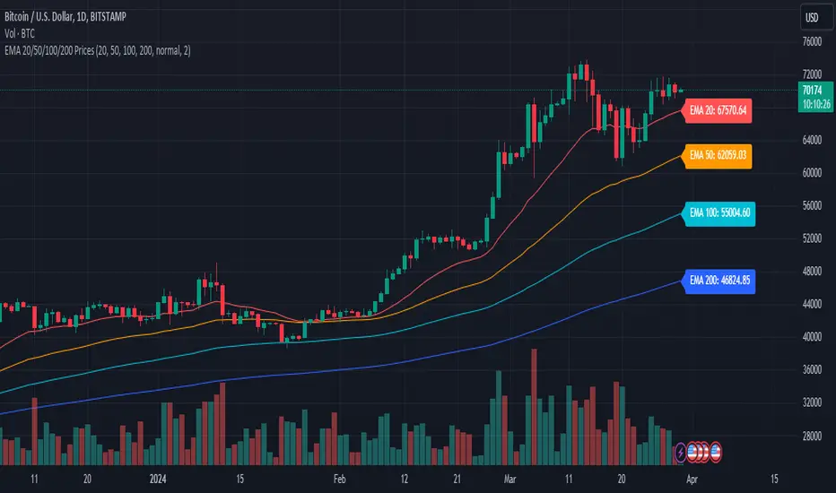 Introducing the EMA Indicator with Dynamic Labels, a unique addition to the TradingView Public Library. This innovative script enhances trend analysis and decision-making by overlaying four Exponential Moving Averages (EMAs) – 20, 50, 100, and 200 periods – on your chart, each with a distinct color for quick identification.