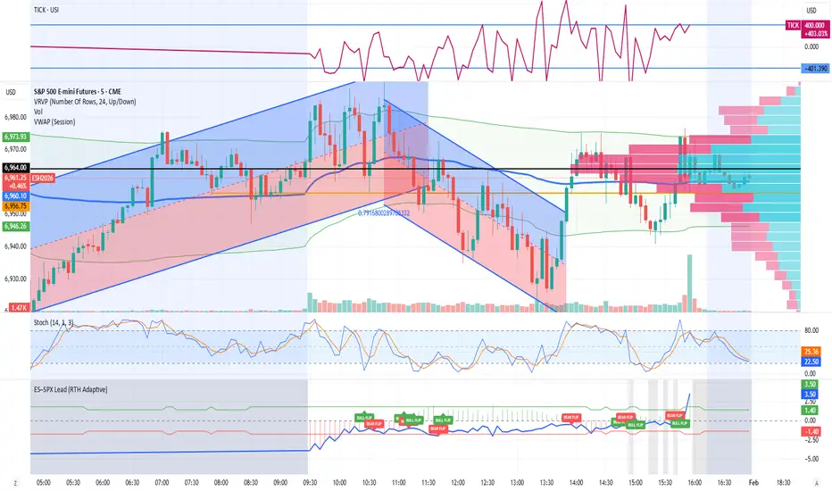 Uses Z Score to evaluate if /Es is leading SPX (or not) and /ES VWAP to establish bullish (+1) or bearish territory (-1). Histogram is the product of Z Score times VWAP status, red or green depending.