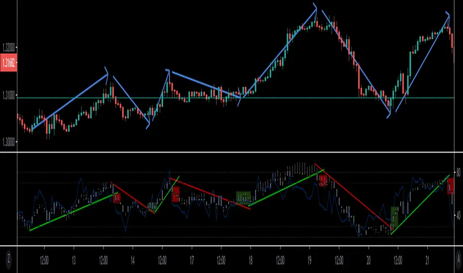 For example: Place your chart on 1H and draw your trendlines on the indicator. Set the extra timeframe to 4H of 1D to see the overall trend and motion.