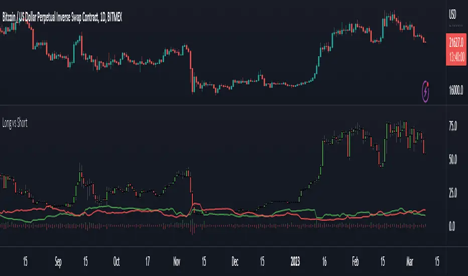 Ratio of total long vs short orders. Candles are calculated by ((BITFINEX:BTCUSDLONGS / BITFINEX:BTCUSDSHORTS) + (BITFINEX:ETHUSDLONGS / BITFINEX:ETHUSDSHORTS))/2. BTC and ETH can be viewed separately or inverted in the settings.