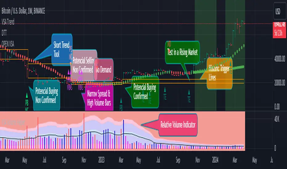 Vsa Trend is a tool that utilizes the principles of Volume Spread Analysis (VSA) to identify potential trading opportunities. This tool highlights several principles such as PB, PBNC, PS, PSNC, TE, ND, Short Trend Tool, Trigger Lines, and Multiple Alignment of Trends.