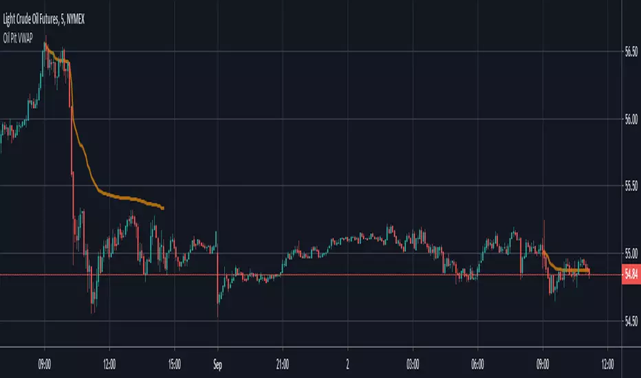 Oil future traders commonly watch the pit session VWAP (9:00am to 2:30pm). The Oil Pit VWAP indicator overlays the VWAP from 9-2:30 (using hlc3) onto any futures asset, but its probably only useful for oil...