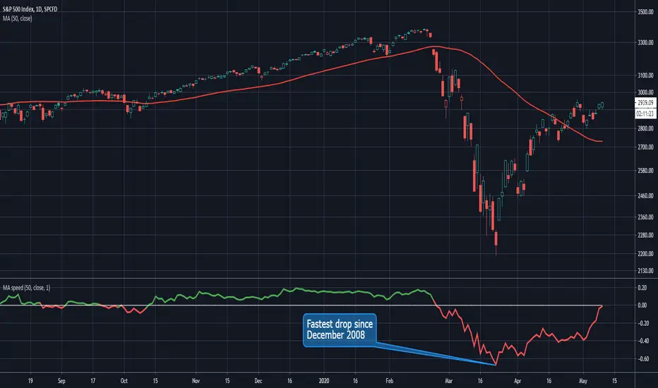 MA Speed plots the simple 1-day percentage change similar to an oscillator at the bottom of the chart, color-coding for positive or negative values.