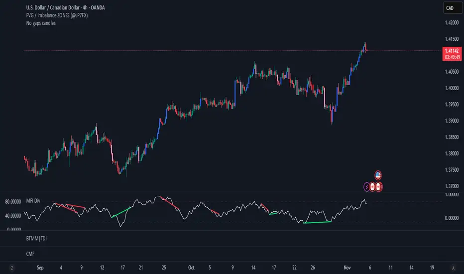 Displays divergences as green (bullish) or red (bearish) lines on the MFI chart.