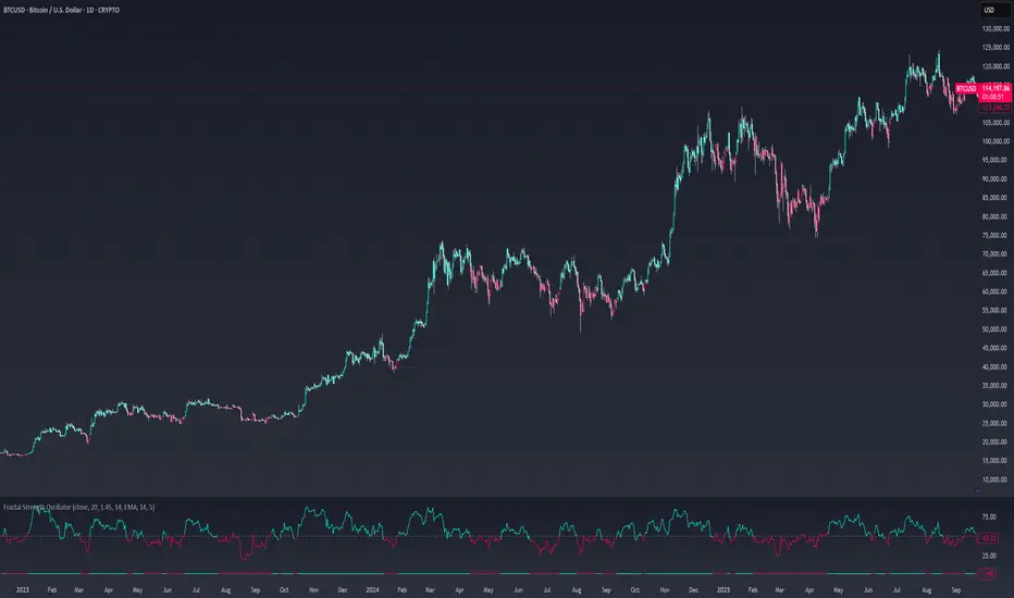 The Fractal Strength Oscillator Indicator combines the Relative Strength Index (RSI) and Fractal Dimension Index (FDI) to identify market momentum and trend direction. By integrating RSI's momentum signals with FDI's fractal-based trend analysis, this indicator provides clear visual cues for bullish and bearish conditions through colored plots and price bars.