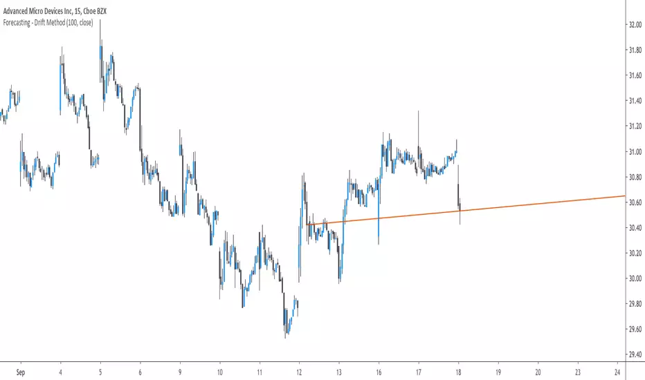 Basically a drift forecast is like a linear extrapolation, first you take the first and last point of your data and draw a line between those points, extend this line into the future and you have a forecast, thats pretty much it.