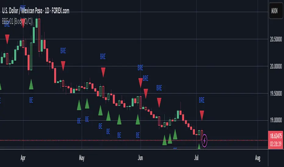 - BE = Bullish Engulfing (green triangle below bar). BRE = Bearish Engulfing (red triangle above).