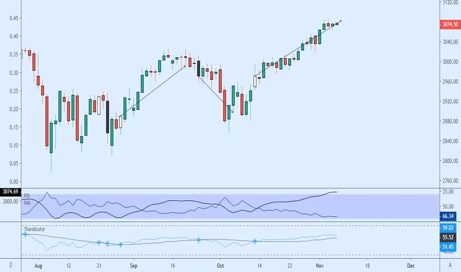 The Thandicator uses a cross of 30 RSI and 20 SMA bound to the RSI close. It's purpose is to mimic the RSI 14 / MA 5 cross and to highlight when to go long or short.