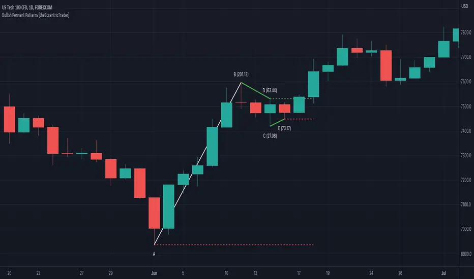 This indicator automatically draws bullish pennant patterns and price projections derived from the ranges that constitute the patterns.