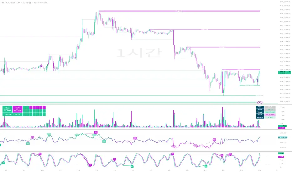 공급 구간 (보라색): 매도 압력이 증가할 수 있는 잠재적 저항 영역입니다. 가격이 이 구간에 진입할 때 하락 반전 신호나 거부 반응을 주시하세요.