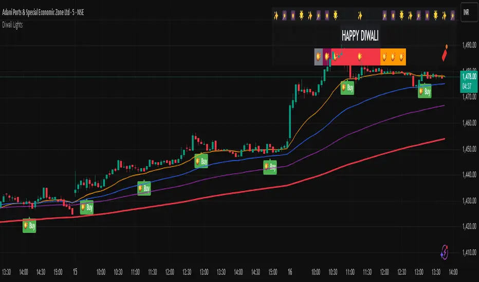“Diwali Lights Pro — 7-Diyas Signal Matrix” is a precision-built trend-sentiment indicator that blends the glow of seven technical “diyas” — each representing a different momentum or strength dimension — into one intuitive signal matrix. It was designed to celebrate light, discipline, and clarity in trading — helping traders filter noise, identify strong trend shifts, and take trades with conviction. Each diya is powered by a proven indicator component: RSI, Stochastic, EMA trend strength, and momentum slopes.Together, they light up your chart with buy/sell signals only when technical confluence aligns — like the diyas of Diwali shining in harmony.