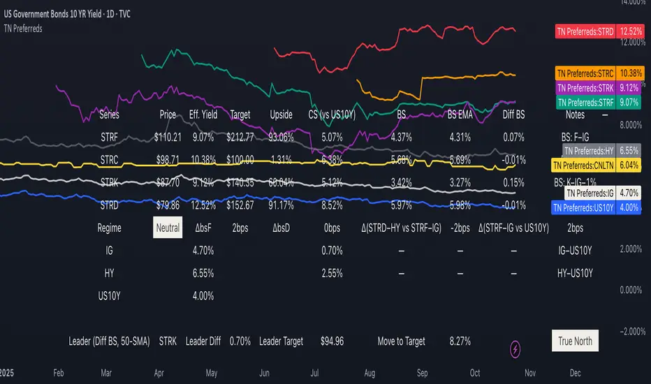 TN Preferreds is a yield-centric dashboard for bitcoin backed preferreds that overlays effective yields. It builds credit/benchmark spread series, a simple regime model (Risk-On / Cautious / Risk-Off), and a compact table that surfaces price, yield, target, upside and diagnostics—so you can quickly judge relative value and risk conditions.