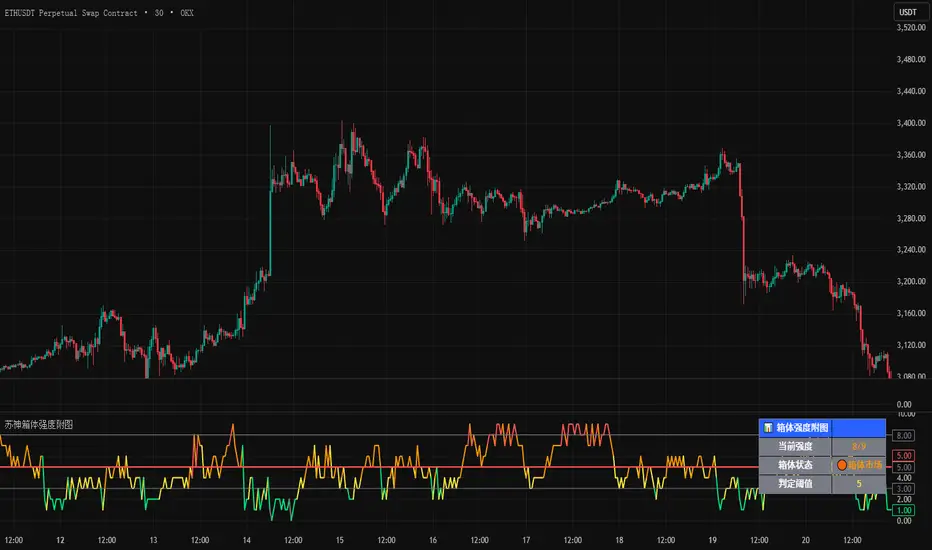 This indicator detects market consolidation ("box") phases by integrating signals from nine technical methods, including ADX trend strength, ATR volatility, Bollinger Band width, price range, moving average dispersion, RSI oscillation, volume contraction, and candlestick body size. It outputs a composite score and visual alerts when multiple signals align, helping traders identify ranging markets and potential breakout setups. Users can customize sensitivity by adjusting which methods are active and the confirmation threshold.