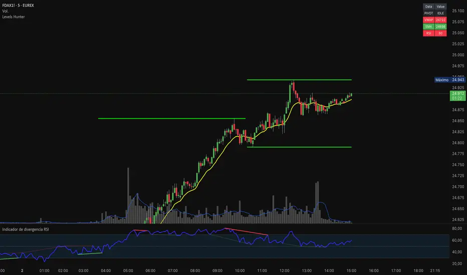 Levels Hunter (Fussion) is an advanced technical indicator for TradingView created for fast intraday and scalping traders operating on 1 min, 3 min, and 5 min charts. It integrates automatic pivot detection, trend evaluation with EMA, volume-weighted VWAP, and RSI momentum, while also tracking All-Time High/Low levels in real-time.