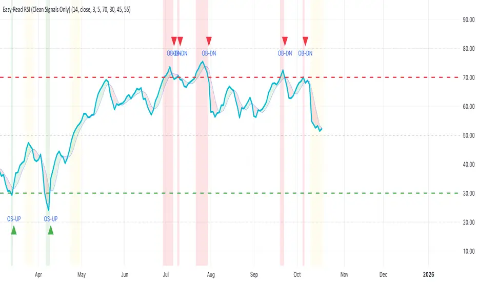 An easy-to-read RSI (Relative Strength Index) indicator that highlights market momentum and potential turning points using simple colors and visual signals. It smooths the RSI line slightly with an EMA and adds a signal line for reference, then clearly marks the key RSI zones: red background when the market is overbought (RSI ≥ 70), green background when oversold (RSI ≤ 30), and yellow background when the RSI is neutral (around 45–55). This helps traders quickly see whether momentum is strong, weak, or balanced without needing to interpret small RSI movements.In addition to background colors, the indicator plots two key signals on the RSI panel: