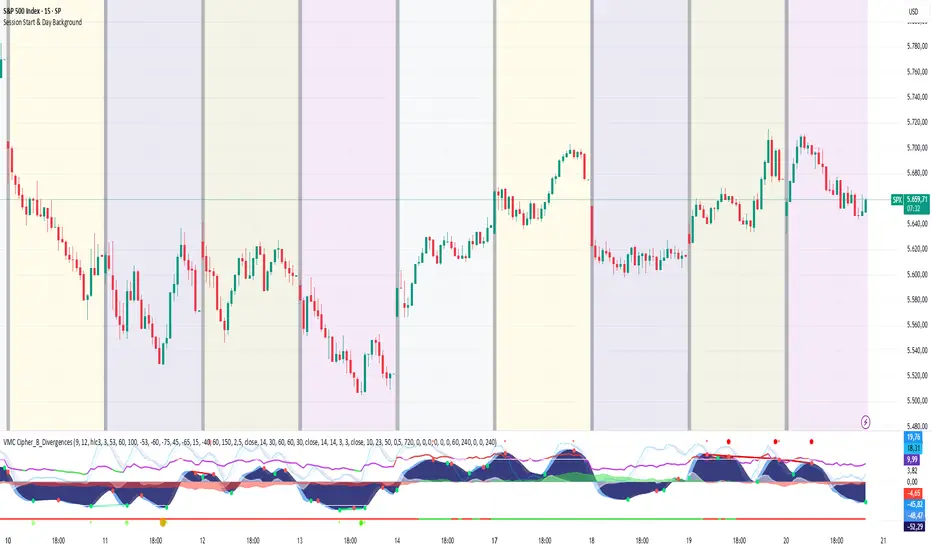 This indicator visually enhances your TradingView charts by highlighting the start of each new trading day and coloring the background based on the day of the week.