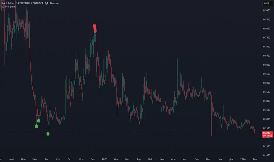ED by bigmm identifies significant price divergences from the 200-period Exponential Moving Average (EMA) by analyzing closing and opening price extremes. This tool marks the three most recent candles with the largest percentage deviations.