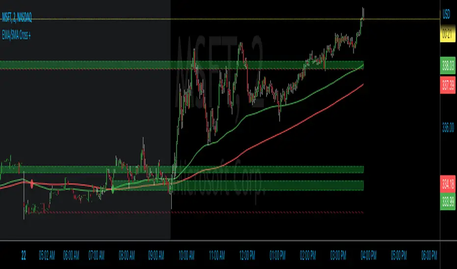 Introducing the EMA/SMA Cross +, a powerful and customizable indicator designed specifically for TradingView. This indicator is unlike any other, as it combines the strengths of both Exponential Moving Average (EMA) and Simple Moving Average (SMA) in conjunction with supply and demand zones to provide you with a comprehensive understanding of price action. The EMA/SMA Cross + is perfect for traders looking for an edge in the market.