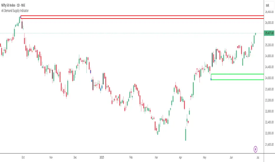 The Demand-Supply Zone Indicator is a powerful tool designed to help traders identify high-probability reversal and continuation zones across any market or timeframe. Inspired by institutional trading concepts, this indicator visually highlights areas where strong buying (demand) or selling (supply) has taken place, allowing you to make better-informed trading decisions.