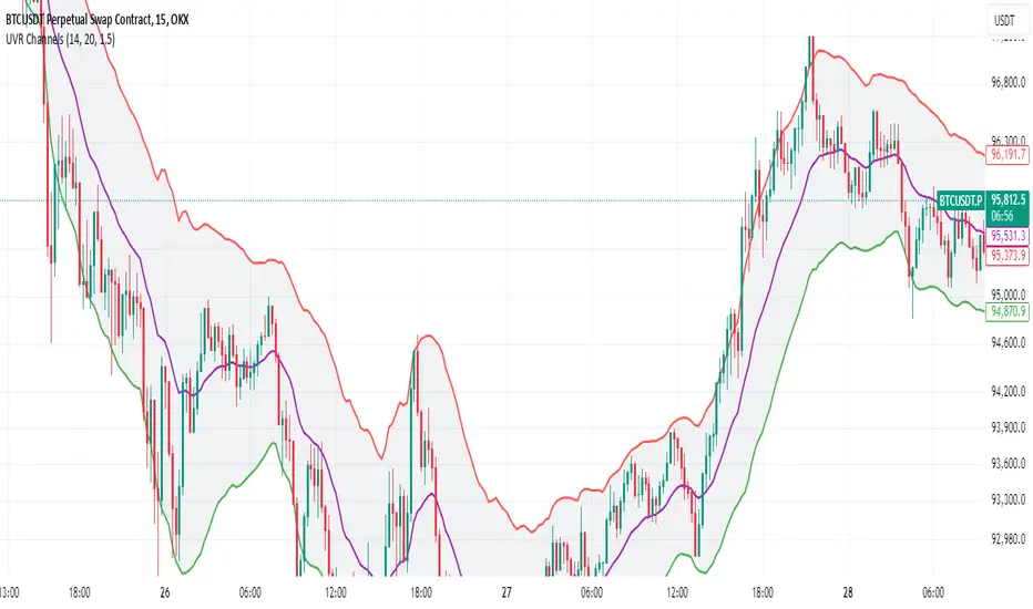 UVR Channels are designed to dynamically measure market volatility and identify key price levels for potential trend reversals. The channels are calculated using a unique volatility formula(UVR) combined with an EMA as the central reference point. This approach provides traders with a tool for evaluating trends, reversals, and market conditions such as breakouts or consolidations.