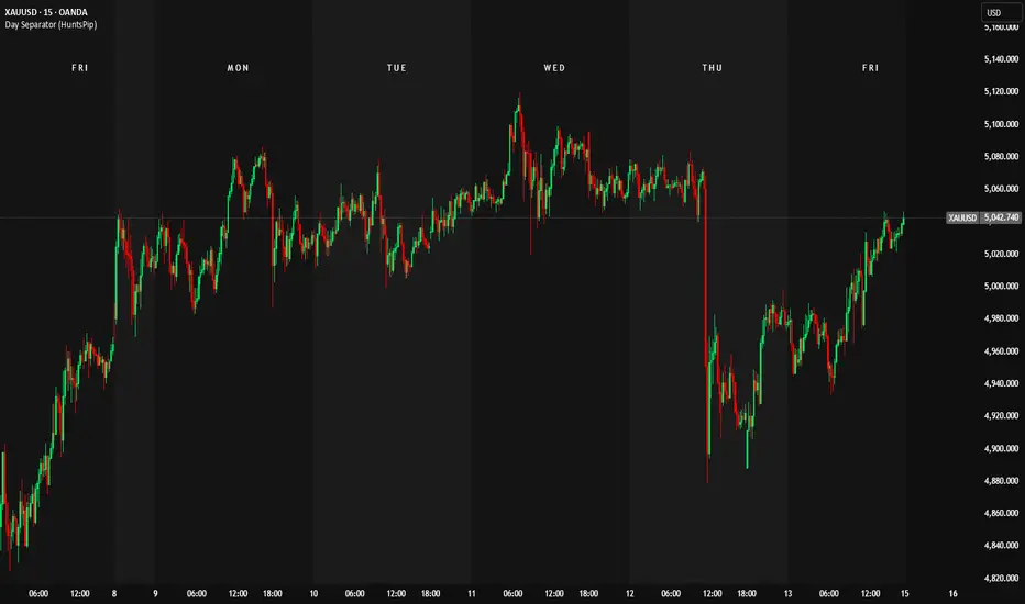 Day Separator (HuntsPip) adds alternating background shading and day-of-week labels to intraday charts, making it easy to visually distinguish each trading day at a glance.