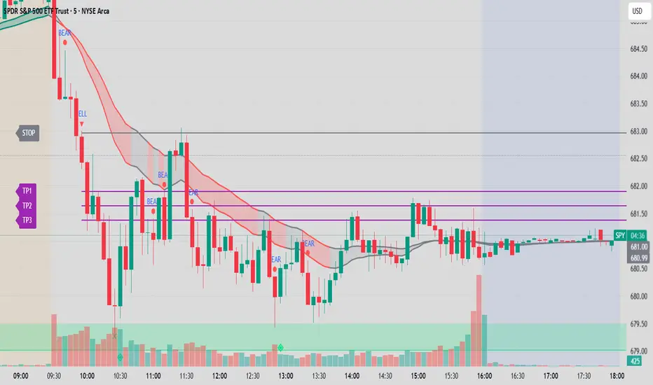 This script is built for active intraday traders trading SPY, QQQ, It focuses on trend continuation and directional momentum rather than scalping chop. It works best during regular market hours with extended hours enabled.