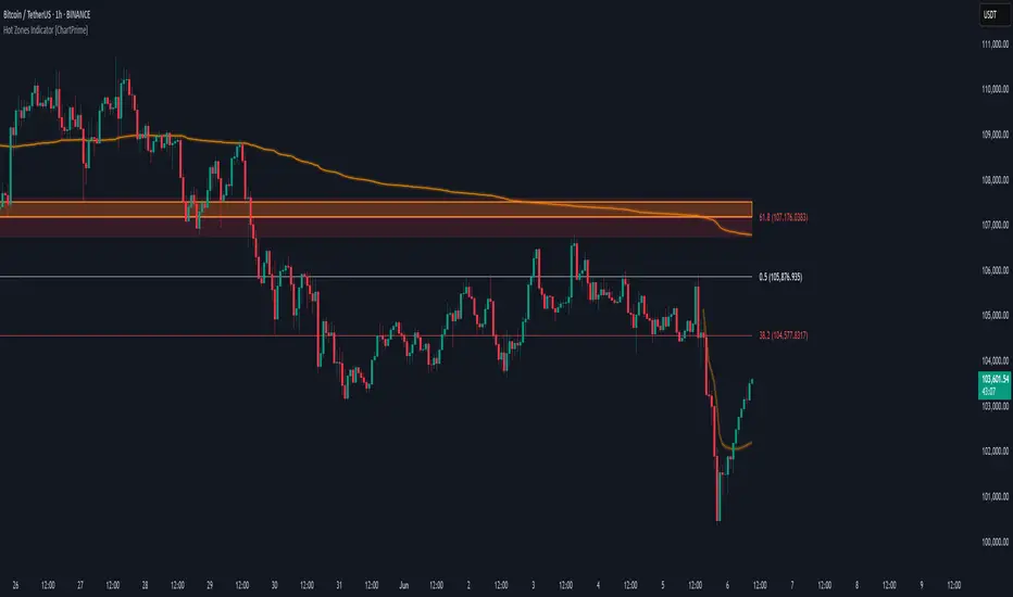 Hot Zones by ChartPrime represents a multi-dimensional confluence engine, transforming traditional retracement mapping into a reactive, data-driven framework. By integrating structure, volume flow, and momentum analytics into a unified interface, it enhances discretionary and systematic trading decisions alike. Whether trading trend continuations, reversals, or liquidity anomalies, Hot Zones enables actionable clarity at structurally significant levels.