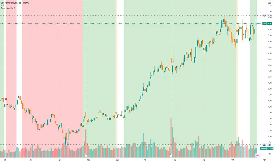 Trend Pulse LTM v2 is a dynamic trend-following overlay indicator designed for traders seeking clear, actionable signals in volatile markets. It simplifies trend analysis by highlighting key momentum shifts with minimal noise, helping you spot potential entry and exit opportunities without overwhelming your chart.Key Signals