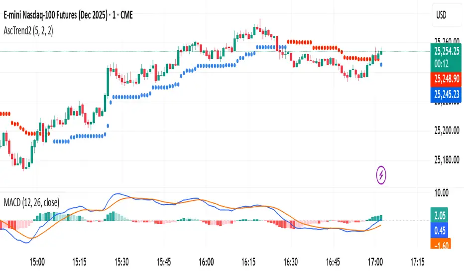 AscTrend Dots overlays simple color-coded dots directly on price to highlight the current trend and potential shifts. Dots below candles suggest bullish control; dots above suggest bearish pressure. When a dot flips side, it flags a possible trend change or momentum break—ideal for quick visual reads without clutter.