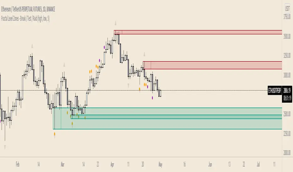 An experimental script that marks out the last two unbroken fractal high and low zones. The aim of the script is to focus on the type of candles that form and close in a zone. They can either tap into the zone or break them.