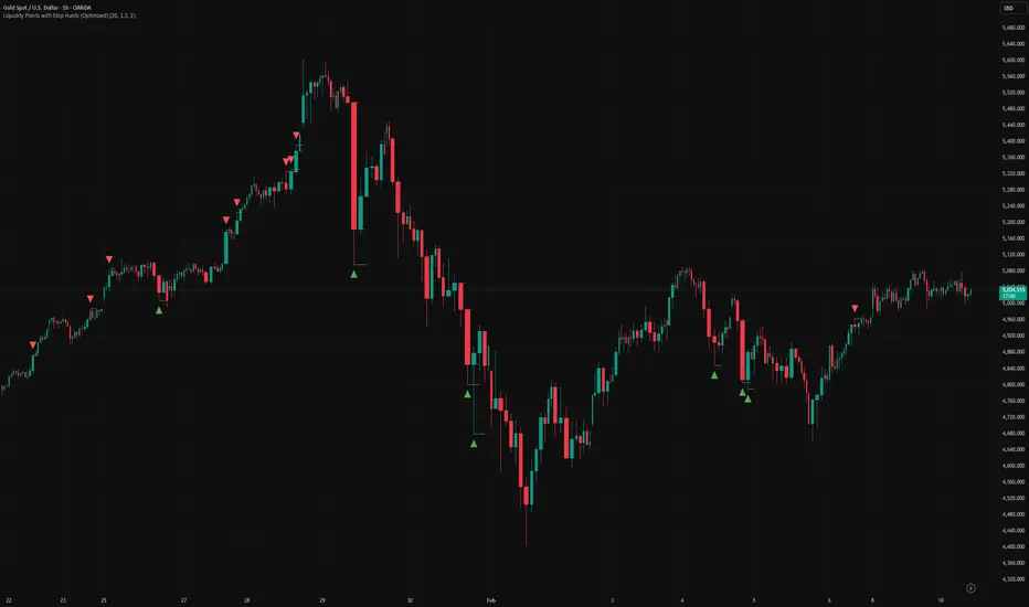 The Liquidity Points with Stop Hunts (Optimized) indicator is designed to identify "trapped" volume and structural turning points specifically in high-volatility environments like Gold (GC).
