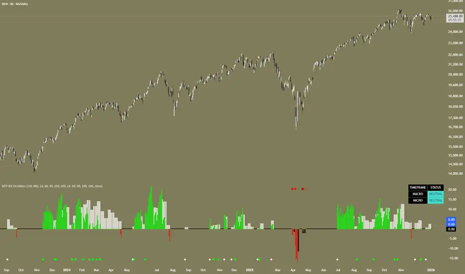 MTF RSI Oscillator is a non-repainting, multi-timeframe RSI visualization tool designed to help traders align lower-timeframe momentum with a higher-timeframe market regime.