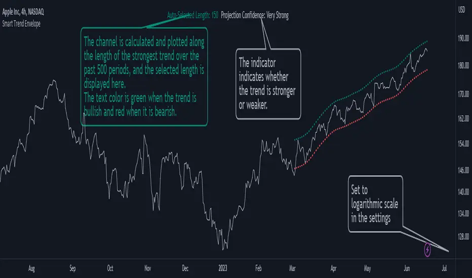 The "Smart Trend Envelope" indicator has been specifically designed and coded to be used in logarithmic scale. It takes advantage of the logarithmic scale's ability to represent exponential price movements accurately. Therefore, it is highly recommended to use this indicator with the chart set to logarithmic scale for optimal performance and reliable trend analysis, especially on higher timeframes.