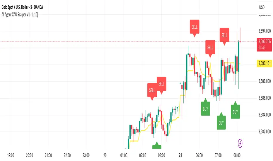 AI Agent XAU Scalper V1 is a custom indicator designed to help traders read the XAU/USD (Gold) market direction more quickly and clearly, especially on lower timeframes (M1–M15).
