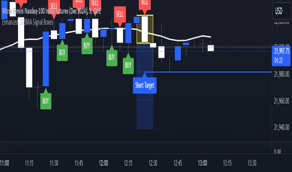 This indicator leverages the 20-period Simple Moving Average (SMA) to generate clear and actionable trading signals. Designed for traders looking to streamline their entry and exit decisions, the script provides a visual hierarchy with dynamic signal boxes and target levels.