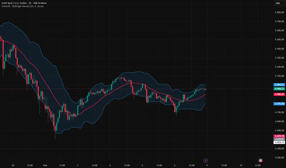 stelaraX – Bollinger Bands is a classic volatility-based indicator designed to visualize price dispersion around a moving average. The script plots the Bollinger Bands directly on the chart, allowing traders to assess volatility, potential mean reversion zones, and dynamic support and resistance levels.