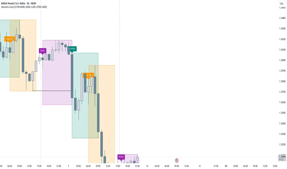 FOREXSOM Session Boxes (Local Time) highlights the three major Forex sessions — Asian, London, and New York — using your chart’s local timezone automatically.
