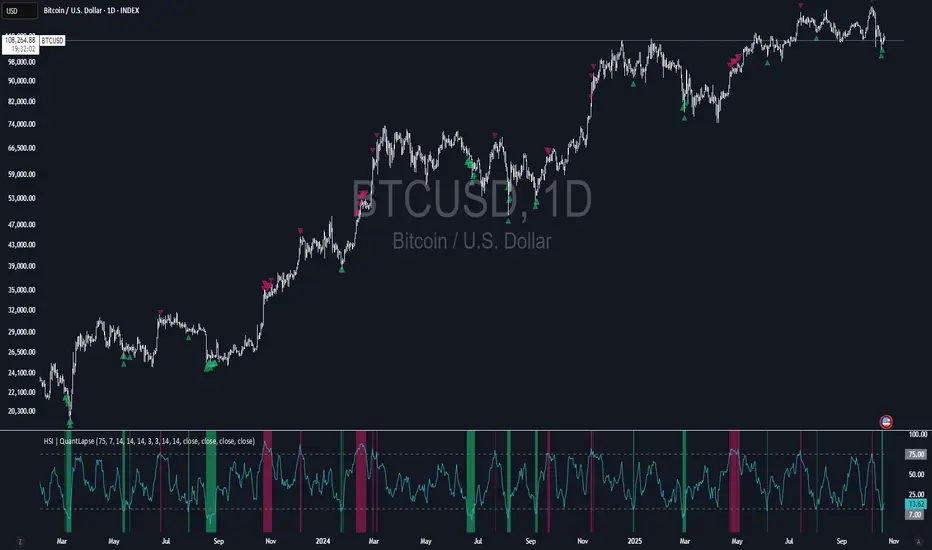 The Hyper Strength Index | QuantLapse distills multiple dimensions of market strength into a single, cohesive oscillator. By merging price, volume, and directional momentum, it provides traders with a more robust, responsive, and context-aware perspective on market dynamics — a next-generation evolution beyond the limitations of RSI or CMO alone.