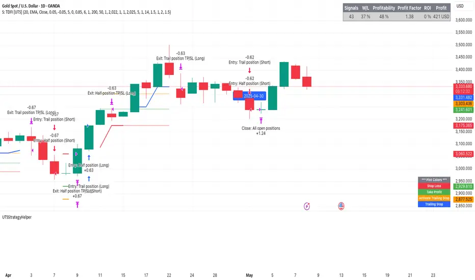 Calculates the take profit price using a distance determined by ATR multiplied by a factor. Example for Long trade TP: PRICE + (ATR * factor). When take profit price is reached usually 50 % of the position is closed and the other 50 % get a trailing stop assigned.