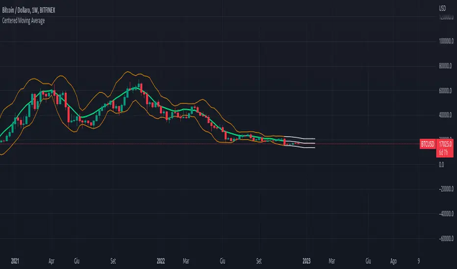 In addition to this, however, the script is also able to estimate the potential projection of future data based on the available data by replicating where necessary the data of the last bar until the number of data necessary for the calculation of the required centered moving average is reached.