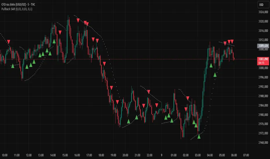Description: The "Pullback SAR" is an advanced indicator built on the classic Parabolic SAR but with additional functionality for detecting pullbacks. It helps identify moments when the price pulls back from the main trend, offering potential entry signals. Perfect for traders looking to enter the market after a correction.