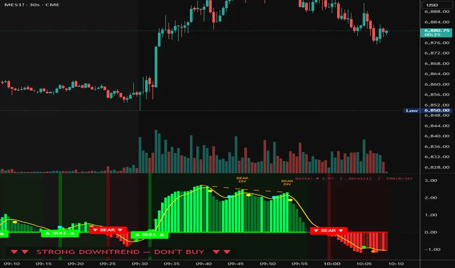 A context-aware trend strength and momentum indicator designed for active traders who need to know not just which way the trend is going, but how hard it's pushing and whether it's still accelerating or running out of gas.