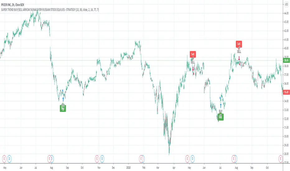 Currently, pharmaceutical companies such as Pfizer NYSE:PFE, which are involved in the development of a vaccine against the virus and are showing success, are attractive to investors. The Pfizer NYSE:PFE Buy and Sell Arrow Signals Indicator With Performance is designed for trading Pfizer assets. This script analyzes historical data and current quotes and generates Buy and Sell trading signals. The indicator is based on a combination of large and small period moving averages combined with the ATR, MACD indicator. Bollinger Bands indicator is used for filter. Also shown is the performance of a strategy based on the Pfizer NYSE:PFE Buy / Sell Signals indicator.