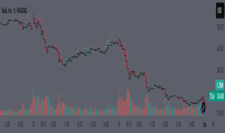 A bias-first momentum system. The HUD shows Bull% / Bear% / Volume% and EMA state (9/20/50).Scores come from three weighted pieces: