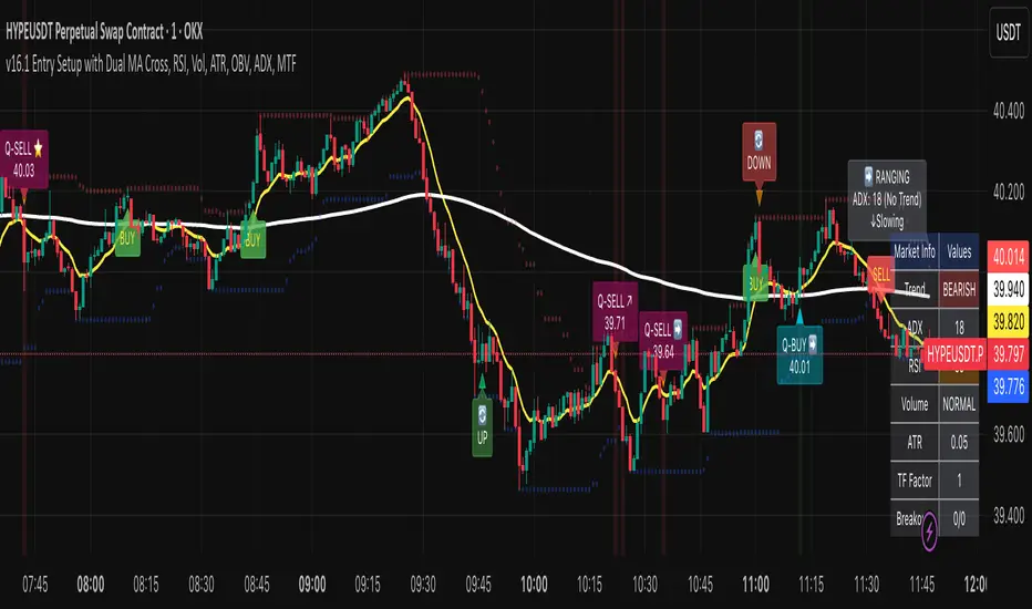 Setup Entry with Simple MA Cross, RSI, Vol, ATR, OBV, ADX at MTF.