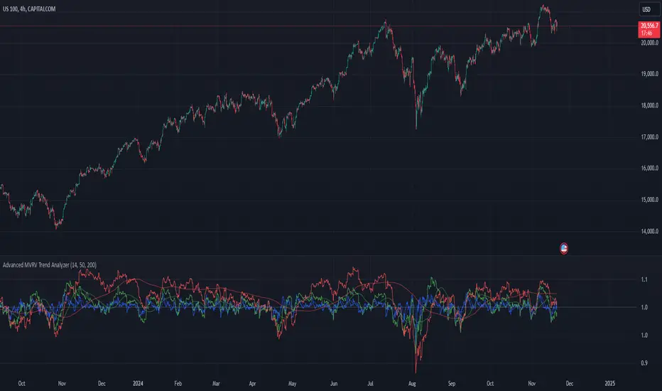 The "Advanced MVRV Trend Analyzer" is a sophisticated trading tool designed for the TradingView platform that enhances traditional Market Value to Realized Value (MVRV) analysis. It provides a multi-timeframe perspective of market valuation dynamics by comparing the current market price to the realized price across short-term, mid-term, and long-term cohorts. This indicator is particularly useful for cryptocurrency traders and investors who seek deeper insights into potential overvaluation or undervaluation conditions in the market.
